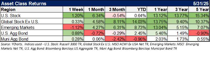 You would think that there is some glaring weakness in portfolios with all the headlines in the first five months of the year, but global equities are positive, taxable bonds are positive, and alternatives (specifically Gold) are also positive. There are pockets of weakness in Municipals, Small Cap Stocks, and certain stock sectors, but a well-balanced portfolio has held up very well through May. We believe there is certainly more volatility to come given the ever-evolving tariff story, fiscal spending battles in Congress, monetary policy decisions, and all the other “known unknowns.” So, it is important to buckle up for a potentially bumpy ride.